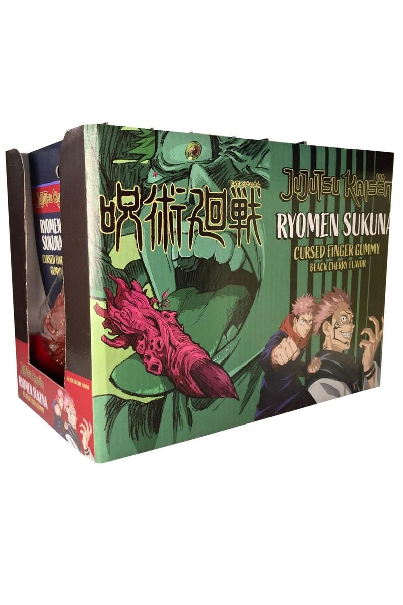 The detailed life-size cursed finger of Ryomen Sukuna is a 1.8 ounce gummy, black cherry flavored. Packed 9 per display
