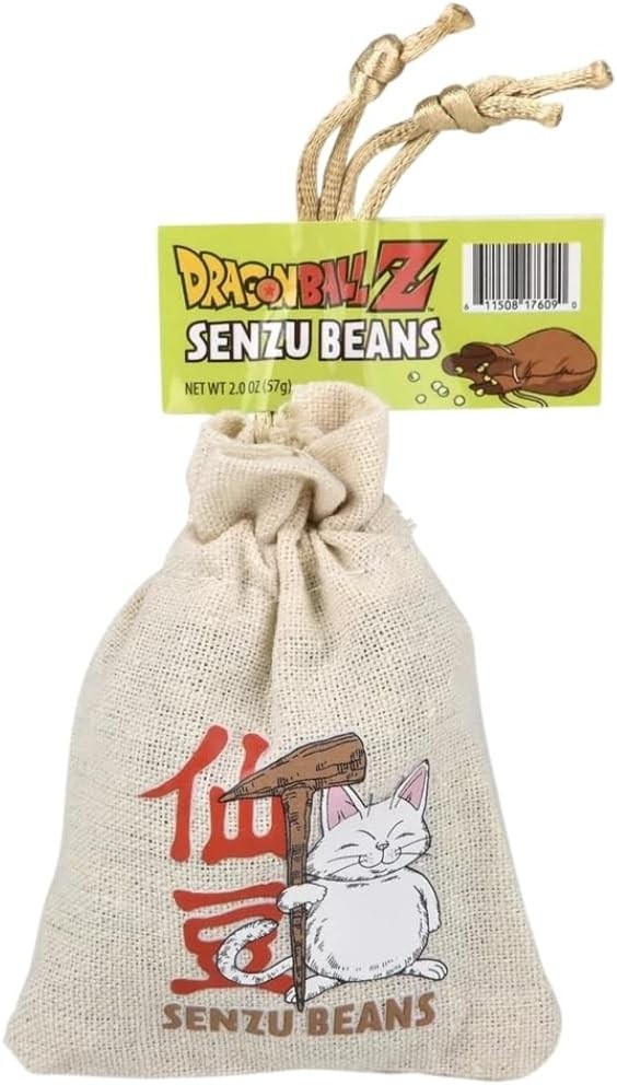 Senzu Beans From the popular show Dragonball Z! Fruit flavored candy sours in a printed cloth bag. Packed 18 bags per display.