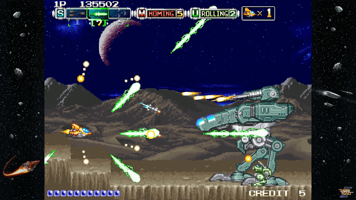 Andro Dunos (アンドロデュノス, in japanese) is a side scrolling arcade game from shoot’em up category (Shmup).Developed by Visco and Distributed in 1992 by SNK ON Neo-Geo MVS and Neo-Geo AES. Licensed by PixelHeart since 2020.